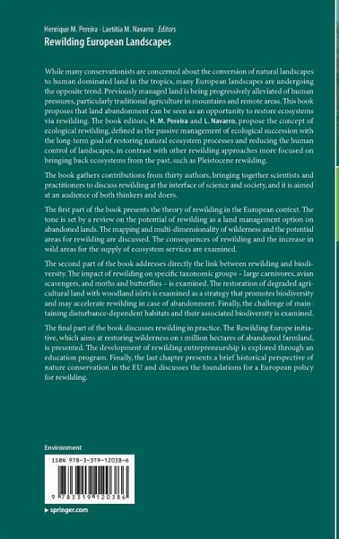 Some European lands have been progressively alleviated of human pressures, particularly traditional agriculture in remote areas. This book proposes that this land abandonment can be seen as an opportunity to restore natural ecosystems via rewilding. We define rewilding as the passive management of ecological successions having in mind the long-term goal of restoring natural ecosystem processes. The book aims at introducing the concept of rewilding to scientists, students and practitioners. The first part presents the theory of rewilding in the European context. The second part of the book directly addresses the link between rewilding, biodiversity, and habitats. The third and last part is dedicated to practical aspects of the implementation of rewilding as a land management option. We believe that this book will both set the basis for future research on rewilding and help practitioners think about how rewilding can take place in areas under their management.