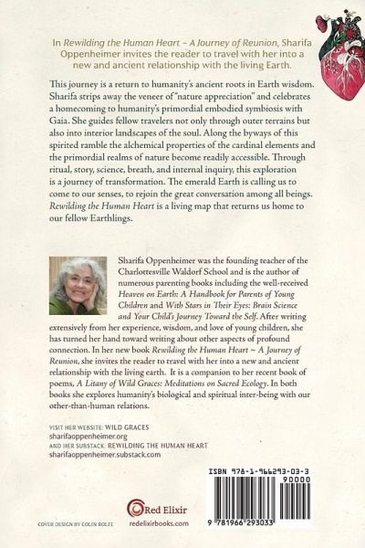 In Rewilding the Human Heart ~ A Journey of Reunion, Sharifa Oppenheimer invites the reader to travel with her into a new and ancient relationship with the living Earth. This journey is a return to humanity's ancient roots in Earth wisdom. Sharifa strips away the veneer of "nature appreciation" and celebrates a homecoming to humanity's primordial embodied symbiosis with Gaia. She guides fellow travelers not only through outer terrains but also into interior landscapes of the soul. Along the byways of this spirited ramble the alchemical properties of the cardinal elements and the primordial realms of nature become readily accessible. Through ritual, story, science, breath, and internal inquiry, this exploration is a journey of transformation. The emerald Earth is calling us to come to our senses, to rejoin the great conversation among all beings. Rewilding the Human Heart is a living map that returns us home to our fellow Earthlings.
