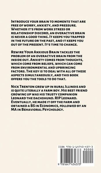 Introduce your brain to moments that are free of worry, anxiety, and pressure. Whether it's from work stress or relationship discord, an overactive brain is never a good thing. It keeps you trapped in the future or the past, and it keeps you out of the present. It's time to change. Your anxious brain is completely within your control. Really. Rewire Your Anxious Brain tackles the problem of an overactive brain from the inside out. Anxiety comes from thoughts, which come from beliefs, which can come from environmental and upbringing factors. The key is to deal with all of these aspects simultaneously, and this book offers you the tools to do that. Stop dwelling on the negative with therapy techniques. Nick Trenton grew up in rural Illinois and is quite literally a farm boy. His best friend growing up was his trusty companion Leonard the dachshund. RIP Leonard. Eventually, he made it off the farm and obtained a BS in Economics, followed by an MA in Behavioral Psychology. Deconstruct the cycle of anxiety and conquer it. -Learning how to emotionally calibrate to deal with hardships -The simple ABCDE method for anxiety and overcoming overwhelm -How to manage your expectations and change your beliefs -How to use three columns to see a different perspective -How to turn your anxiety and worrying into an actual superpower How to overcome feeling paralyzed and terrified - and start living your life.