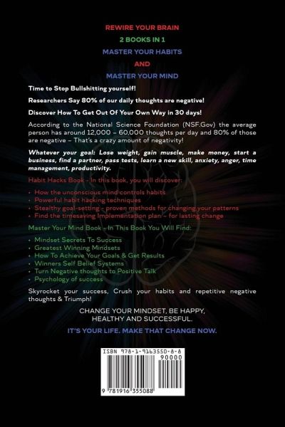 Time to Stop Bullshitting yourself! Researchers Say 80% of our daily thoughts are negative! Discover How To Get Out Of Your Own Way in 30 days! According to the National Science Foundation (NSF.Gov) the average person has around 12,000 - 60,000 thoughts per day and 80% of those are negative - That's a crazy amount of negativity! Whatever your goal: Lose weight, gain muscle, make money, start a business, find a partner, pass tests, learn a new skill, anxiety, anger, time management, productivity. Habit Hacks Book - In this book, you will discover: · How the unconscious mind controls habits · Powerful habit hacking techniques · Stealthy goal-setting - proven methods for changing your patterns · Find the timesaving Implementation plan - for lasting change Master Your Mind Book - In This Book You Will Find:Mindset Secrets To Success Greatest Winning Mindsets How To Achieve Your Goals & Get Results Winners Self Belief Systems Turn Negative thoughts to Positive Talk Psychology of success