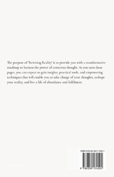 The purpose of 'Rewiring Reality' is to provide you with a transformative roadmap to harness the power of conscious thought. As you turn these pages, you can expect to gain insights, practical tools, and empowering techniques that will enable you to take charge of your thoughts, reshape your reality, and live a life of abundance and fulfilment. In this book, we embark on a compelling journey into our thoughts' extraordinary influence over our reality. Together, we will explore the profound concept of conscious thought and how it can shape every aspect of our existence. By rewiring our minds, we hold the power to create a new reality, break free from limitations, and manifest our deepest desires.