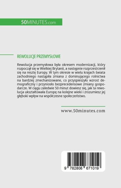 Rewolucja przemys¿owa by¿a okresem modernizacji, który rozpocz¿¿ si¿ w Wielkiej Brytanii, a nast¿pnie rozprzestrzeni¿ si¿ na reszt¿ Europy. W tym okresie w wielu krajach ¿wiata zachodniego nast¿pi¿a zmiana z dominuj¿cego rolnictwa na bardziej zmechanizowane, co przyspieszy¿o wzrost demograficzny i przynios¿o bezprecedensowe zmiany gospodarcze. W ci¿gu zaledwie 50 minut dowiesz si¿, jak ta rewolucja uksztätowäa Europ¿ na kolejne wieki i zrozumiesz jej g¿¿boki wp¿yw na wspó¿czesne spo¿ecze¿stwo. Ta prosta i pouczaj¿ca ksi¿¿ka zawiera dok¿adne omówienie najwäniejszych wynalazków rewolucji przemys¿owej, w tym silnika parowego i silnika spalinowego. Zawiera równie¿ pe¿n¿ biografi¿ bohaterów, w tym Jamesa Watta i Thomasa Edisona, cenne wprowadzenie do kontekstu ekonomicznego i ocen¿ wp¿ywu rewolucji przemys¿owej, daj¿c ci wszystkie niezb¿dne informacje na temat tego kluczowego okresu, który uksztätowä nowoczesne spo¿ecze¿stwo.
