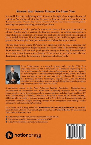 In a world that moves at lightning speed, it's easy to lose sight of our deepest dreams and aspirations. Yet, within each of us lies the power to shape our destiny and transform those dreams into reality. "Rewrite Your Future: Dreams Do Come True" is your essential guide to unlocking that power and taking control of your future. This transformative book is perfect for anyone who dares to dream and is determined to achieve. Whether you're a personal development enthusiast, an aspiring entrepreneur, a career changer, or a student at a crossroads, this book provides the inspiration and practical advice needed for success. Through compelling stories and actionable strategies, you'll find guidance for breaking free from past limitations and fully embracing the present. "Rewrite Your Future: Dreams Do Come True" equips you with the tools to prioritize your dreams, measure progress, and adjust your actions to achieve them. Your journey to a brighter future starts here. With this book, you'll gain the courage to dream big, the determination to act, and the commitment to see it through. It's time to rewrite your future and make your dreams come true. Join the community of dreamers and achievers today.