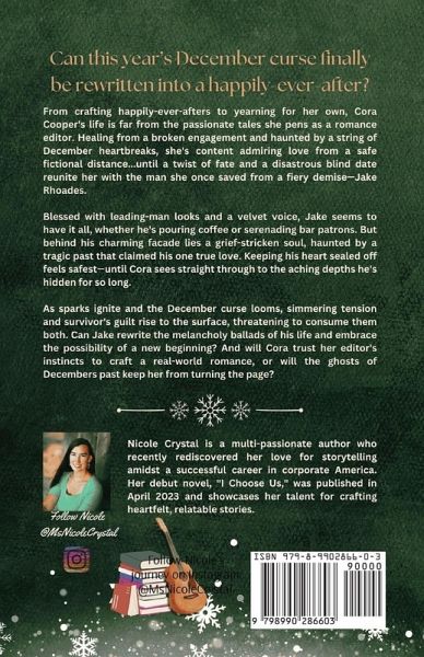Rewriting December by Nicole Crystal A romance novel about two broken souls who find healing and redemption in each other's arms. Cora Cooper and Jake Rhoades first cross paths when a tragic car accident brings them together one snowy December night. Years later, a chance meeting at a coffee shop rekindles their connection, but both are scarred by painful pasts. As Jake and Cora navigate their growing feelings amidst the ghosts of December's past, they must learn to trust in love again if they hope to have a future together. With tender give and take, two fractured hearts begin building something truly right in this moving tale of second chances.