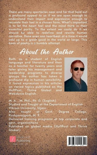There are many spectacles nearby and farfetched that hold out a profound appeal to us if we are open enough to understand their import and expressive enough to recreate their feel in a chosen form. What's important is to let the heart feel and the mind think in their essential purity. To the extent we could do it we should be able to redefine and rewrite human narrative. Done even one heartbeat at a time it would add up to a great good in the world at large. This book of poetry is a humble attempt.