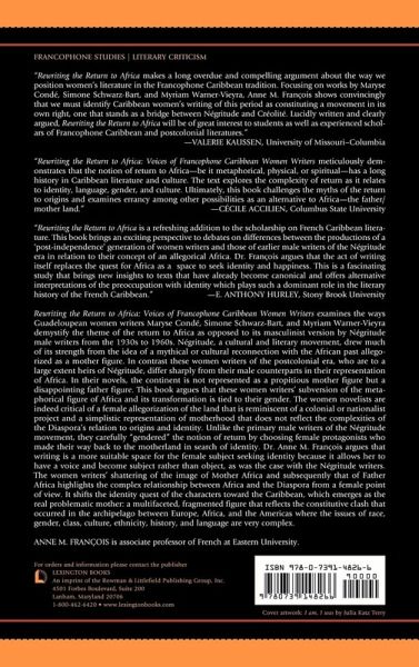 Rewriting the Return to Africa: Voices of Francophone Caribbean Women Writers examines how post-colonial women writers Maryse Condé, Simone Schwarz-Bart and Myriam Warner Vieyra emerged with a new vision of the notion of origins and identity and in the process revised the myth of the return to Africa previously constructed by Négritude writers in the 1930s. Their works reveal that the rediscovery of Caribbean history and culture leads to a new awareness of hybridity in identity and culture.