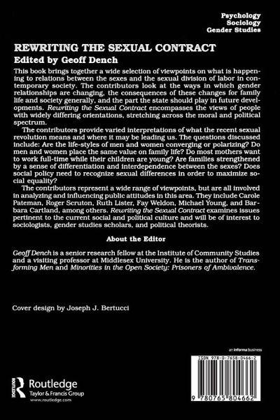 This book brings together a wide selection of viewpoints on what is happening to relations between the sexes and the sexual division of labor in contemporary society. The contributors look at the ways in which gender relationships are changing, the consequences of these changes for family life and society generally, and the part the state should play in future developments. Rewriting the Sexual Contract encompasses the views of people with widely differing orientations, stretching across the moral and political spectrum. The contributors provide varied interpretations of what the recent sexual revolution means and where it may be leading us. The questions discussed include: Are the life-styles of men and women converging or polarizing? Do men and women place the same value on family life? Do most mothers want to work full-time while their children are young? Are families strengthened by a sense of differentiation and interdependence between the sexes? Does social policy need to recognize sexual differences in order to maximize social equality? The contributors represent a wide range of viewpoints, but are all involved in analyzing and influencing public attitudes in this area. They include Carole Pateman, Roger Scruton, Ruth Lister, Fay Weldon, Michael Young, and Barbara Cartland, among others. Rewriting the Sexual Contract examines issues pertinent to the current social and political culture and will be of interest to sociologists, gender studies scholars, and political theorists. Geoff Dench is a senior research fellow at the Institute of Community Studies and a visiting professor at Middlesex University. He is the author of Transforming Men and Minorities in the Open Society: Prisoners of Ambivalence.