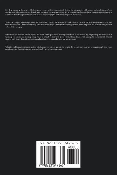 Dive deep into the prehistoric world where giants roamed and mysteries abound. Crafted for young readers with a thirst for knowledge, this book embarks on an enlightening journey through time, tracing the footsteps of the iconic T-Rex, along with its friends and foes. This isn't just a recounting of ancient tales, but a fresh perspective on old narratives, debunking myths, and illuminating lesser-known facts. Unravel the complex relationships among the Cretaceous creatures and unearth the environmental, physical, and behavioral intricacies that once dominated our planet. While the towering T-Rex takes center stage, a plethora of intriguing creatures, captivating tales, and profound insights await readers within these pages. Furthermore, the narrative extends beyond the realms of the prehistoric, drawing connections to our present day, emphasizing the importance of preserving our history, and inspiring young minds to embark on their own quests for knowledge. Infused with a delightful conversational tone and peppered with vibrant illustrations, this book strikes a balance between education and entertainment. Perfect for budding paleontologists, curious minds, or anyone with an appetite for wonder, this book is more than just a voyage through time; it's an invitation to view the world, past and present, through a lens of curiosity and awe.