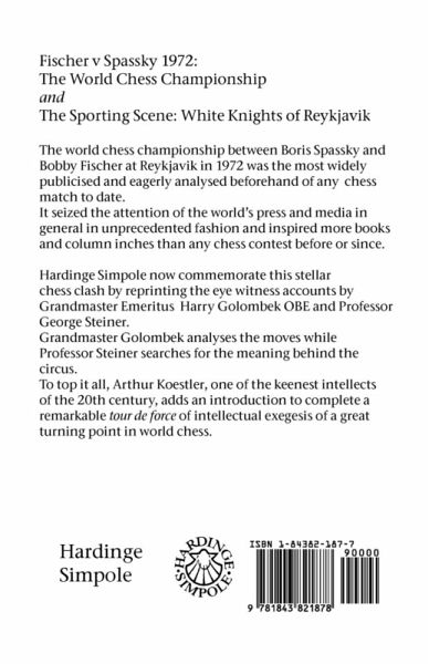 The world chess championship between Boris Spassky and Bobby Fischer at Reykjavik in 1972 was the most widely publicised and eagerly analysed beforehand of any chess match to date. It seized the attention of the world's press and media in general in unprecedented fashion and inspired more books and column inches than any chess contest before or since. Hardinge Simpole now commemorate this stellar chess clash by reprinting the eye witness accounts by Grandmaster Emeritus Harry Golombek OBE and Professor George Steiner. Grandmaster Golombek analyses the moves while Professor Steiner searches for the meaning behind the circus. To top it all, Arthur Koestler, one of the keenest intellects of the 20th century, adds an introduction to complete a remarkable tour de force of intellectual exegesis of a great turning point in world chess.