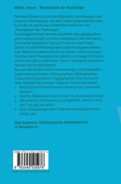 Darmuntersuchungen.- Ösophagusbreischluck (Doppelkontrast-Technik).- Ösophagusbreischluck (Monokontrast).- Magen-Duodenum-Darstellung.- Dünndarm-Doppelkontrastdarstellung.- Kolondoppelkontrasteinlauf.- Kolonfüllung über einen Anus praeter.- Defäkographie.- Eigenes Rezept.- Arthrographien.- Handgelenk.- Schulter.- Kniegelenk.- Oberes Sprunggelenk.- Kontrastmittel-Organuntersuchungen.- Bronchographie.- Cholezystcholangiographie.- Galaktographie.- Hysterosalpingographie.- Ausscheidungsurographie.- Lymphographie.- Miktionszystourethrographie.- Sialographie.- Eigenes Rezept.- Myelographien.- Thorakale Myelographie.- Lumbale Myelographie.- Computertomographie.- Ösophagus.- Oberbauch.- Abdomen.- Becken.- CT der LWS nach intrathekaler KM-Gabe (Myelo-CT).- Eigenes Rezept.- Gefäßdarstellungen: Obere Körperhälfte.- Carotis-interna-DSA.- Vertebralis-DSA.- Halsgefäßangiographie (i.a. Injektion).- Halsgefäß-DSA (zentralvenöse Injektion).- Halsgefäß-DSA (peripher-venöse Injektion).- Aortenbogenangiographie (konventionell).- Aortenbogen-DSA (peripher-venös).- V. cava superior-Angiographie.- Koronarangiographie.- Pulmonalis-DSA (zentral-venös).- Pulmonalis-DSA.- Handangiographie.- Shuntdarstellung.- Armphlebographie.- Eigenes Rezept.- Untere Körperhälfte.- Kavographie (konventionell).- Kavographie (DSA).- Aortographie (konventionell).- Aortographie (DSA).- Zöliakographie (konventionell).- Zöliakographie (DSA).- Mesenterikographie (konventionell).- Mesenterikographie (DSA).- Nierenangiographie (konventionell, Übersicht).- Nieren-DSA (peripher-venös, Übersicht).- Nierenangiographie (konventionell, selektiv).- Becken-Bein-Angiographie (konventionell, transfemoral).- Becken-Bein-Angiographie (translumbal).- Beinangiographie (FNP-DSA).- Beinphlebographie.-Kavernosographie.- Eigenes Rezept.- Perkutane interventionelle Maßnahmen.- Diagnostische Punktion.- Dilatation von Gefäßen im Extremitäten-und Beckenbereich.- Dilatation der A. renalis.- Drainage der Gallenwege.- Kavafilterimplantation (Günther-Filter).- Kavafilterimplantation (Kimray-Greenfield-Filter).- Lyse eines Gefäßthrombus im Extremitätenbereich.- Okklusionsbehandlung, dauerhaft.- Okklusionsbehandlung, passager.- Okklusionsbehandlung der V. spermatica.- Venenblutentnahme (Renin, Nierenvenen).- Venenblutentnahme (ACTH und Kortisol, Sinus-petrosus).- Verödung von Nierenzysten.- Eigenes Rezept.