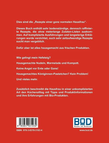 Dies sind die "Rezepte einer ganz normalen Hausfrau". Dieses Buch enthält sehr bodenständigedennoch raffinierte Rezepte, die ohne meterlange Zutaten-Listen auskommen. Auf komplizierteAusführungen und langwierige Erklärungen wurde verzichtet, auch sehr zeitaufwendige Rezeptesucht man vergeblich.Dafür aber ist alles hausgemacht aus frischen Produkten.Wie gelingt mein Hefeteig?Hausgemachte Nudeln, Marmelade und Kompott.Keine Angst vor Ente oder Gans!Hausgemachte Königinnen-Pastetchen? Kein Problem!Und vieles mehr.Zusätzlich beschreibt die Hausfrau in einer unkomplizierten Art den Küchenalltag mit Tipps und Produktinformationen und ihre Erfahrungen mit Bio-Produkten.