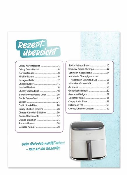 Schnell, einfach, knusprig! Willkommen in deiner neuen Lieblingsküche! Mit dem Airfryer wird Kochen zum Kinderspiel: kein stundenlanges Schnippeln, keine komplizierten Zutaten - nur leckere Gerichte, die ruckzuck auf dem Teller landen. Egal, ob du abends Lust auf einen richtig guten Cheeseburger hast, am Wochenende knusprige Lángos servieren willst oder einfach schnell ein paar süß-scharfe Kokos-Shrimps aus dem Korb zaubern möchtest - hier findest du das passende Rezept. Perfekt für Einsteiger, Berufstätige und alle, die es unkompliziert lieben.