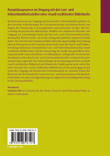 Rezeptionsprozesse im Umgang mit literarischer Unbestimmtheit gehören zu den zentralen Anforderungen des Literaturunterrichts und können bereits von Beginn der Primarstufe an herausgefordert und unterstützt werden. Die Entwicklung entsprechender didaktischer Modelle setzt empirische Befunde zum Umgang von Leseanfänger_innen mit den Leer- und Unbestimmtheitsstellen literarischer Werken voraus, wie sie die vorliegende qualitativ-empirische Studie liefert. Das theoretische Fundament bildet dabei die eigenständige Entwicklung einer an Konzepten aus der Literaturwissenschaft sowie der Kunst- und Medienforschung orientierten Systematik der Leer- und Unbestimmtheitsstellen visuell erzählender Bilderbücher. Darüber hinaus liegt der Studie eine gründliche Sichtung innerhalb unterschiedlicher Fachdisziplinen vorliegender theoretischer Annahmen zu den durch Leer- und Unbestimmtheitsstellen evozierten Rezeptionsprozessen zugrunde. Die Untersuchung von Rezeptionsgesprächen zu einem visuell erzählenden Bilderbuch im Rahmen der Studie macht nicht zuletzt das hohe Potenzial des visuell erzählenden Bilderbuchs als Rezeptionsgegenstand sowie des Umgangs mit literarischer Unbestimmtheit als zentralen Schritt der Rezeption für das literarische Lernen im Lese- und Literaturunterricht deutlich. Damit liefert sie einen wichtigen Beitrag zur empirischen Grundlagenforschung in der Literaturdidaktik.