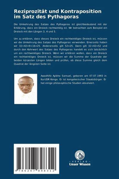 Die Umkehrung des Satzes des Pythagoras ist gleichbedeutend mit der Erklärung, dass ein Dreieck rechtwinklig ist. Wir betrachten zum Beispiel ein Dreieck mit den Längen 3, 4 und 5. Um zu erklären, dass dieses Dreieck ein rechtwinkliges Dreieck ist, müssen wir die Umkehrung des Satzes des Pythagoras verwenden. Einerseits haben wir 32+42=9+16=25. Andererseits gilt 52=25. Dann gilt 32+42=52 und durch den Kehrwert des Satzes des Pythagoras handelt es sich tatsächlich um ein rechtwinkliges Dreieck. Wenn wir erklären wollen, dass ein Dreieck ein rechtwinkliges Dreieck ist, müssen wir die Summe der Quadrate der beiden kürzesten Längen bilden und prüfen, ob diese Summe gleich dem Quadrat der längsten Seite ist.