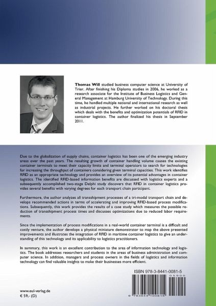 Due to the globalization of supply chains, container logistics has been one of the emerging industry areas over the past years. The resulting growth of container handling volume causes the existing container terminals to meet their capacity limits and terminal operators to search for technologies for increasing the throughput of containers considering given terminal capacities. This work identifies RFID as an appropriate technology and provides an overview of its potential advantages in container logistics. The identified RFID-based information benefits are discussed with logistics experts and a subsequently accomplished two-stage Delphi study discovers that RFID in container logistics provides several benefits with varying degrees for each transport chain participant. Furthermore, the author analyzes all transshipment processes of a tri-modal transport chain and develops recommended actions in terms of accelerating and improving RFID-based process modifications. Subsequently, this work provides the results of a case study which measures the possible reduction of transshipment process times and discusses optimizations due to reduced labor requirements. Since the implementation of process modifications in a real-world container terminal is a difficult and costly venture, the author develops a physical miniature demonstrator to map the above presented improvements and illustrates the integration of RFID in maritime container logistics to give an understanding of this technology and its applicability to logistics practitioners. In summary, this work is an excellent contribution to the area of information technology and logistics. The book addresses researchers and students in the areas of business administration and computer science. In addition, managers and process owners in the fields of logistics and information technology can find valuable insights to make their businesses more efficient.