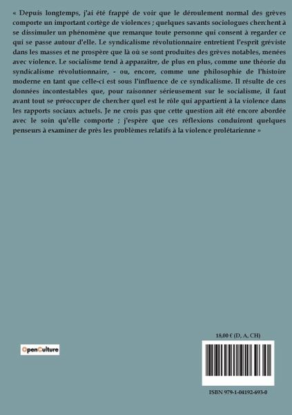 « Depuis longtemps, j'ai été frappé de voir que le déroulement normal des grèves comporte un important cortège de violences ; quelques savants sociologues cherchent à se dissimuler un phénomène que remarque toute personne qui consent à regarder ce qui se passe autour d'elle. Le syndicalisme révolutionnaire entretient l'esprit gréviste dans les masses et ne prospère que là où se sont produites des grèves notables, menées avec violence. Le socialisme tend à apparaître, de plus en plus, comme une théorie du syndicalisme révolutionnaire, - ou, encore, comme une philosophie de l'histoire moderne en tant que celle-ci est sous l'influence de ce syndicalisme. Il résulte de ces données incontestables que, pour raisonner sérieusement sur le socialisme, il faut avant tout se préoccuper de chercher quel est le rôle qui appartient à la violence dans les rapports sociaux actuels. Je ne crois pas que cette question ait été encore abordée avec le soin qu'elle comporte ; j'espère que ces réflexions conduiront quelques penseurs à examiner de près les problèmes relatifs à la violence prolétarienne »
