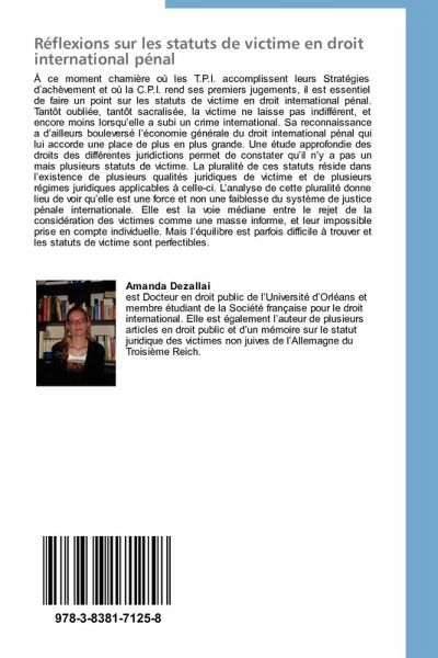 À ce moment charnière où les T.P.I. accomplissent leurs Stratégies d achèvement et où la C.P.I. rend ses premiers jugements, il est essentiel de faire un point sur les statuts de victime en droit international pénal. Tantôt oubliée, tantôt sacralisée, la victime ne laisse pas indifférent, et encore moins lorsqu elle a subi un crime international. Sa reconnaissance a d ailleurs bouleversé l économie générale du droit international pénal qui lui accorde une place de plus en plus grande. Une étude approfondie des droits des différentes juridictions permet de constater qu il n y a pas un mais plusieurs statuts de victime. La pluralité de ces statuts réside dans l existence de plusieurs qualités juridiques de victime et de plusieurs régimes juridiques applicables à celle-ci. L analyse de cette pluralité donne lieu de voir qu elle est une force et non une faiblesse du système de justice pénale internationale. Elle est la voie médiane entre le rejet de la considération des victimes comme une masse informe, et leur impossible prise en compte individuelle. Mais l équilibre est parfois difficile à trouver et les statuts de victime sont perfectibles.