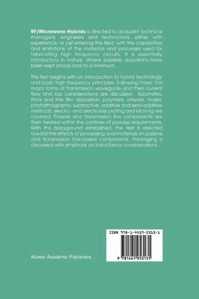 In 1991 this author published a monograph[l] based on his experience teaching microwave hybrid materials and processing technology at the annual ISHM (now the International Microelectronics and Packaging Society, IMAPS) symposia. Since that time, the course has been presented at that venue and on-site at a number of industrial and government organizations. The course has been continually revised to reflect the many evolutionary changes in materials and processes. Microwave technology has existed for almost 175 years. It was only after the invention of the klystron, just before World War II, that microwave design and manufacture moved from a few visionaries to the growth the industry sees today. Over the last decade alone there have been exploding applications for all types of high frequency electronics in the miltary, automotive, wireless, computer, telecommunications and medical industries. These have placed demands, unimaginable a decade ago, on designs, materials, processes and equipment to meet the ever expanding requirements for increasingly reliable, smaller, faster and lower cost circuits.