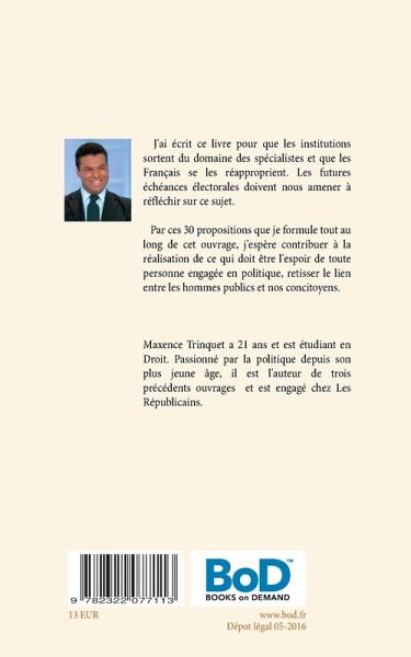 J'ai écrit ce livre pour que les institutions sortent du domaine des spécialistes et que les Français se les réapproprient. Les futures échéances électorales doivent nous amener à réfléchir sur ce sujet.La complexité de la réalisation de ce livre résidait dans la conciliation entre les repères que constituent les institutions et les changements nécessaires pour les rapprocher, ou parfois les éloigner des Français.Par ces 30 propositions que je formule tout au long de cet ouvrage, j'espère contribuer à la réalisation de ce qui doit être l'espoir de toute personne engagée en politique, retisser le lien entre les hommes publics et nos concitoyens.Par une parole présidentielle plus forte, par un gouvernement moins pléthorique, par une opposition responsabilisée au Parlement, avec la revalorisation des institutions locales ainsi que le redéfinition du Conseil économique social et environnemental, par un rapprochement des préfets avec la population, grâce à reconsidération complète de l'administration, par un geste symbolique concernant la Justice et par une sensibilisation pédagogique aux institutions, le lien de défiance entre les Français et la chose publique sera distendu et s'instituera alors la confiance.Notre ambition doit être de faire en sorte que chaque Français connaisse le nom et les fonctions de ses élus, que chaque Français mesure et comprenne les enjeux politiques, et par-dessus tout que chacun de nos concitoyens puisse avoir le précieux sentiment de participer à la politique française, afin que chacun comprenne que s'il est un sujet transcendant sur lequel on ne peut faire impasse, c'est bien celui de la vie publique.Bonne lecture !