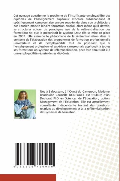 Cet ouvrage questionne le problème de l'insuffisante employabilité des diplômés de l'enseignement supérieur africaine subsaharienne et spécifiquement camerounaise encore sous-tendu dans son architecture par l'ancien modèle binaire formation-emploi, alors même qu'il devrait, se structurer autour du paradigme issu de la référentialisation des formations tel que le préconisait le système LMD dès sa mise en place en 2007. Elle examine le phénomène de la référentialisation dans le contexte de l'élaboration des programmes de formation professionnelle universitaire et de l'employabilité tout en postulant que si l'enseignement professionnel supérieur camerounais appliquait à toutes ses formations un système de référentialisation, peut-être aboutirait-il à une employabilité réussie de ses diplômés.