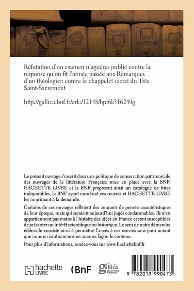 Réfutation d'un examen n'aguères publié contre la response qu'on fit l'année passée aux Remarques d'un théologien contre le chappelet secret du Très Saint-Sacrement Date de l'édition originale: 1634 Le présent ouvrage s'inscrit dans une politique de conservation patrimoniale des ouvrages de la littérature Française mise en place avec la BNF. HACHETTE LIVRE et la BNF proposent ainsi un catalogue de titres indisponibles, la BNF ayant numérisé ces oeuvres et HACHETTE LIVRE les imprimant à la demande. Certains de ces ouvrages reflètent des courants de pensée caractéristiques de leur époque, mais qui seraient aujourd'hui jugés condamnables. Ils n'en appartiennent pas moins à l'histoire des idées en France et sont susceptibles de présenter un intérêt scientifique ou historique. Le sens de notre démarche éditoriale consiste ainsi à permettre l'accès à ces oeuvres sans pour autant que nous en cautionnions en aucune façon le contenu. Pour plus d'informations, rendez-vous sur www.hachettebnf.fr