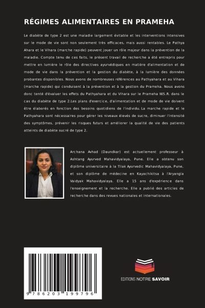 Le diabète de type 2 est une maladie largement évitable et les interventions intensives sur le mode de vie sont non seulement très efficaces, mais aussi rentables. Le Pathya Ahara et le Vihara (marche rapide) peuvent jouer un rôle majeur dans la prévention de la maladie. Compte tenu de ces faits, le présent travail de recherche a été entrepris pour mettre en lumière le rôle des directives ayurvédiques en matière d'alimentation et de mode de vie dans la prévention et la gestion du diabète, à la lumière des données probantes disponibles. Nous avons de nombreuses références au Pathyahara et au Vihara (marche rapide) qui conduisent à la prévention et à la gestion du Prameha. Nous avons donc tenté d'évaluer les effets du Pathyahara et du Vihara sur le Prameha W.S.R. dans le cas du diabète de type 2.Les plans d'exercice, d'alimentation et de mode de vie doivent être élaborés en fonction des besoins quotidiens de l'individu. La marche rapide et le Pathyahara sont nécessaires pour gérer les niveaux élevés de sucre, diminuer l'intensité des symptômes, prévenir les risques futurs et améliorer la qualité de vie des patients atteints de diabète sucré de type 2.
