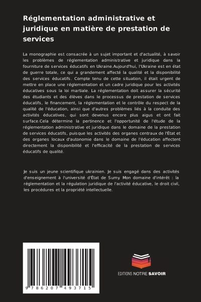 La monographie est consacrée à un sujet important et d'actualité, à savoir les problèmes de réglementation administrative et juridique dans la fourniture de services éducatifs en Ukraine.Aujourd'hui, l'Ukraine est en état de guerre totale, ce qui a grandement affecté la qualité et la disponibilité des services éducatifs. Compte tenu de cette situation, il était urgent de mettre en place une réglementation et un cadre juridique pour les activités éducatives sous la loi martiale. La réglementation doit assurer la sécurité des étudiants et des élèves dans le processus de prestation de services éducatifs, le financement, la réglementation et le contrôle du respect de la qualité de l'éducation, ainsi que d'autres problèmes liés à la conduite des activités éducatives, qui sont devenus encore plus aigus et ont fait surface.Cela détermine la pertinence et l'opportunité de l'étude de la réglementation administrative et juridique dans le domaine de la prestation de services éducatifs, puisque les activités des organes centraux de l'État et des organes locaux d'autonomie dans le domaine de l'éducation affectent directement la disponibilité et l'efficacité de la prestation de services éducatifs de qualité.