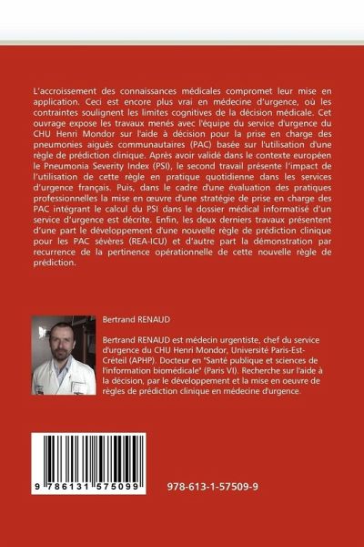 L'accroissement des connaissances médicales compromet leur mise en application. Ceci est encore plus vrai en médecine d'urgence, où les contraintes soulignent les limites cognitives de la décision médicale. Cet ouvrage expose les travaux menés avec l'équipe du service d'urgence du CHU Henri Mondor sur l'aide à décision pour la prise en charge des pneumonies aiguës communautaires (PAC) basée sur l'utilisation d'une règle de prédiction clinique. Après avoir validé dans le contexte européen le Pneumonia Severity Index (PSI), le second travail présente l'impact de l'utilisation de cette règle en pratique quotidienne dans les services d'urgence français. Puis, dans le cadre d'une évaluation des pratiques professionnelles la mise en uvre d'une stratégie de prise en charge des PAC intégrant le calcul du PSI dans le dossier médical informatisé d'un service d'urgence est décrite. Enfin, les deux derniers travaux présentent d'une part le développement d'une nouvelle règle de prédiction clinique pour les PAC sévères (REA-ICU) et d'autre part la démonstration par recurrence de la pertinence opérationnelle de cette nouvelle règle de prédiction.