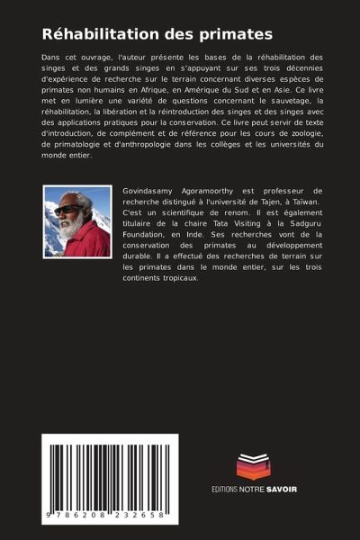Dans cet ouvrage, l'auteur présente les bases de la réhabilitation des singes et des grands singes en s'appuyant sur ses trois décennies d'expérience de recherche sur le terrain concernant diverses espèces de primates non humains en Afrique, en Amérique du Sud et en Asie. Ce livre met en lumière une variété de questions concernant le sauvetage, la réhabilitation, la libération et la réintroduction des singes et des singes avec des applications pratiques pour la conservation. Ce livre peut servir de texte d'introduction, de complément et de référence pour les cours de zoologie, de primatologie et d'anthropologie dans les collèges et les universités du monde entier.