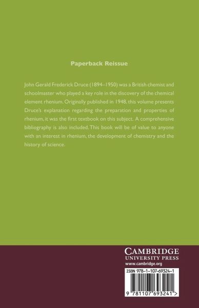 John Gerald Frederick Druce (1894-1950) was a British chemist and schoolmaster who played a key role in the discovery of the chemical element rhenium. Originally published in 1948, this volume presents Druce's explanation regarding the preparation and properties of rhenium, the first textbook on this subject. A comprehensive bibliography is also included. This book will be of value to anyone with an interest in rhenium, the development of chemistry and the history of science.