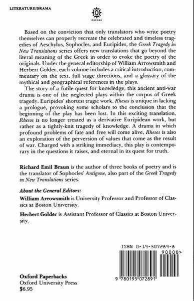 The story of a futile quest for knowledge, this ancient anti-war drama is one of the neglected plays within the corpus of Greek tragedy. Euripides' shortest tragic work, Rhesos is unique in lacking a prologue, provoking some scholars to the conclusion that the beginning of the play has been lost. In this exciting translation, Rhesos is no longer treated as a derivative Euripidean work, but rather as the tightly-knit tragedy of knowledge it really is. A drama in which profound problems of fate and free will come alive, Rhesos is also an exploration of the perversion of values that come as the result of war. Charged with a striking immediacy, this play is contemporary in the questions it raises, and eternal in its quest for truth.