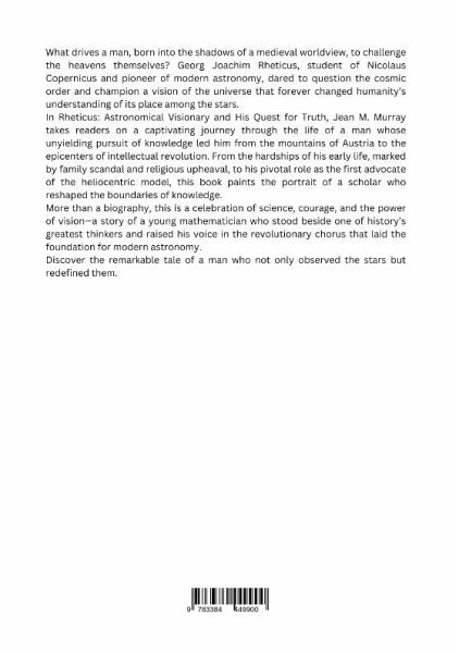 What drives a man, born into the shadows of a medieval worldview, to challenge the heavens themselves? Georg Joachim Rheticus, student of Nicolaus Copernicus and pioneer of modern astronomy, dared to question the cosmic order and champion a vision of the universe that forever changed humanity's understanding of its place among the stars.In Rheticus: Astronomical Visionary and His Quest for Truth, Jean M. Murray takes readers on a captivating journey through the life of a man whose unyielding pursuit of knowledge led him from the mountains of Austria to the epicenters of intellectual revolution. From the hardships of his early life, marked by family scandal and religious upheaval, to his pivotal role as the first advocate of the heliocentric model, this book paints the portrait of a scholar who reshaped the boundaries of knowledge.More than a biography, this is a celebration of science, courage, and the power of vision-a story of a young mathematician who stood beside one of history's greatest thinkers and raised his voice in the revolutionary chorus that laid the foundation for modern astronomy.Discover the remarkable tale of a man who not only observed the stars but redefined them.Let me know if there's anything you'd like to adjust!