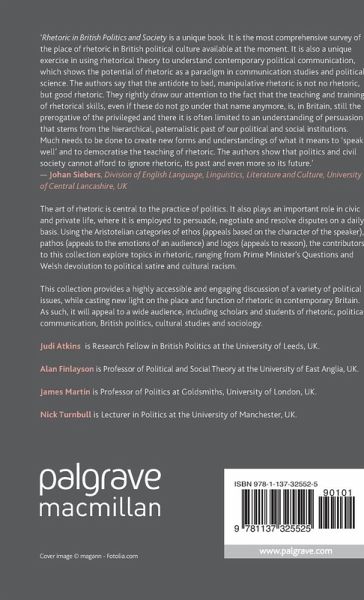 Although the art of rhetoric is central to the practice of politics it also plays an important role in civic and private life. Using Aristotelian notions of ethos, pathos and logos, this collection offers engaging discussions on everything from Prime Minister's Questions and Welsh devolution to political satire and the rhetoric of cultural racism.