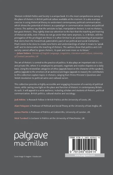Introduction: Rhetoric and the British Way of Politics; Alan Finlayson and James Martin PART I - POLITICS AND LEADERSHIP 1. The Rhetoric of Rhetoric; Nicholas O'Shaughnessy 2. Rhetorical Technique - Aphorisms and Political Persuasion; Robin Burrow and Kevin Morrell 3. Rhetoric and Parliamentary Leadership - Prime Minister's Questions; Christopher Reid 4. Rhetoric and Political Intervention - Churchill's World War Two Speeches in Context; Richard Toye SECTION TWO - IDEOLOGY AND POLICY 5. Rhetoric and Party Politics - Looking Beyond the Leader; Katharine Dommett 6. Rhetoric and the Regions - Time and Space in Welsh Labour Rhetoric on Devolution; David S. Moon 7. Rhetoric and Morality - How the Coalition Justifies Welfare Policy; Richard Hayton and Libby McEnhill SECTION THREE - CULTURE AND SOCIETY 8. Rhetoric and Multiculturalism - David Cameron's 'King James' Speech and the Crisis of Multiculturalism; Bridget Byrne 9. Rhetoric and Race - David Starkey and the 2011 English Riots; Neil Foxlee 10. Rhetoric and Satire - Spitting Image and Political Comedy; Andrew S. Crines 11. Rhetoric and the Everyday - Fairness as Rhetorical Force and the Micro-Politics of Intentionality in a North Manchester Town; Katherine Smith Conclusion: Rhetoric, British Identity and Interdisciplinarity; Judi Atkins and Nick Turnbull
