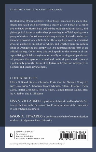 Introduction Lisa S. Villadsen and Jason A. Edwards Chapter 1 "Theorizing Collective Metanoia: Apology, the Penitent Self, and the Penitent State" Adam Ellwanger Chapter 2 "'It May Seem Strange': When Presidents Apologize for Genocide" Bradley A. Serber Chapter 3 "Audiences and the Normative Dimensions of Official Apologies" Kevin Coe Chapter 4 "Between Sovereignty and Vulnerability: Reconciliation, Reparation, and Vexed Agency in Resolutions Apologizing for Slavery" John B. Hatch Chapter 5 "Apology Infinitum: Colonialism And The Need For Repeated Apologies For Canadian Aboriginal Boarding Schools" M. Shivaun Corry Chapter 6 "Corporate Apologies for Slavery: Opportunities for the Rhetoric of History and Renewal" Jeffrey D. Brand Chapter 7 "The Heavy Heart of a Soldier: Apology as Resistance" Claudia Janssen Danyi and Marita Gronvoll Chapter 8 "Exceptional Histories and Obscure Gestures: The United States Government's Official Apology to Native Peoples" Jeremy Cox and T