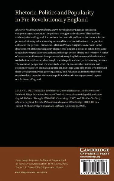 Rhetoric, Politics and Popularity in Pre-Revolutionary England provides an account of the political thought and culture of Elizabethan and early Stuart England. It examines the centrality of humanist rhetoric in the pre-revolutionary educational system and its vital contribution to the political culture of the period. Humanism, Markku Peltonen argues, was crucial to the development of the participatory character of English politics as schoolboys were taught how to speak about taxation and foreign policy, liberty and tyranny. A series of case studies illustrates how pre-revolutionary Englishmen used the rhetorical tools their schoolmasters had taught them in political and parliamentary debates. The common people and the multitude were the orator's chief audience and eloquence was often seen as a popular art. However, there were also those who followed these developments with growing dismay and Peltonen examines further the ways in which populist elements in political rhetoric were questioned in pre-revolutionary England.
