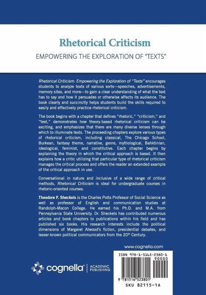 Rhetorical Criticism: Empowering the Exploration of "Texts" encourages students to analyze texts of various sorts-speeches, advertisements, memory sites, and more-to gain a clear understanding of what the text has to say and how it persuades or otherwise affects its audience. The book clearly and succinctly helps students build the skills required to easily and effectively practice rhetorical criticism. The book begins with a chapter that defines "rhetoric," "criticism," and "text," demonstrates how theory-based rhetorical criticism can be exciting, and emphasizes that there are many diverse lenses through which to illuminate texts. The proceeding chapters explore various types of rhetorical criticism, including classical, The Chicago School, Burkean, fantasy theme, narrative, genre, mythological, Bahktinian, ideological, feminist, and constitutive. Each chapter begins by explaining the theory in which the critical approach is based. It then explains how a critic utilizing that particular type of rhetorical criticism manages the critical process and offers the reader an extended example of the critical approach in use. Conversational in nature and inclusive of a wide range of critical methods, Rhetorical Criticism is ideal for undergraduate courses in rhetoric-oriented courses. Theodore F. Sheckels is the Charles Potts Professor of Social Science as well as professor of English and communication studies at Randolph-Macon College. He earned his Ph.D. and M.A. from Pennsylvania State University. Dr. Sheckels has contributed numerous articles and book chapters to publications within his field and has published six books. His research interests include the political dimensions of Margaret Atwood's fiction, presidential debates, and lesser-known political communicators from the 20th Century.