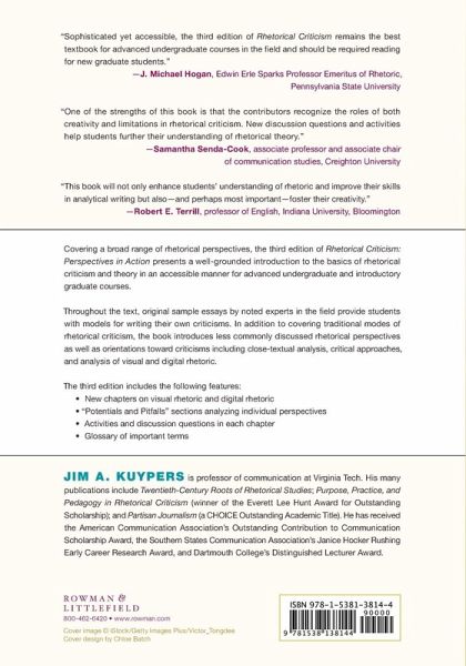 Preface 1. Essential Elements of Rhetorical Criticism: The Big Picture Jim A. Kuypers OVERVIEW OF RHETORICAL CRITICISM 2. What is Rhetoric? Jim A. Kuypers and Andrew King 3. What is Rhetorical Criticism? Jim A. Kuypers 4. Understanding Rhetorical Situations Marilyn Young and Kathleen Farrell 5. Generic Elements in Rhetoric Bill Benoit and Mark Glantz PERSPECTIVES ON CRITICISM 6. The Traditional Perspective Forbes I. Hill 7. Close Textual Analysis: Approaches and Applications Stephen H. Browne 8. Criticism of Metaphor John W. Jordan 9. The Narrative Perspective Robert C. Rowland 10. Dramatism and Kenneth Burke's Pentadic Criticism Ryan Erik McGeough and Andrew King 11. Feminist Criticism Donna Marie Nudd and Kristina Schriver Whalen 12. Ideographical Criticism Ronald Lee and Adam Blood EXPANDING OUR CRITICAL HORIZONS 13. Eclectic Rhetorical Criticism: Combining Perspectives for Insights Jim A. Kuypers 14. Criticism of Visual Rhetoric Natalia Mielczarek 15. Criticism of Popular Culture and Social Media Kristen HoerlandZoe Farquhar 16. Criticism of Digital Rhetoric Michelle G. Gibbons 17. Critical Rhetoric: An Orientation Toward Criticism Raymie McKerrow Appendix A. Writing Criticism: Getting Started Appendix B. Additional Rhetorical Perspectives Appendix C. Glossary of Terms Appendix D. "On Objectivity and Politics in Criticism," Edwin Black Biographical Sketches of Authors