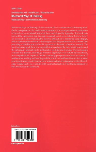Preface.- Chapter 1 Introduction.- Why Rhetorical Thinking.- Overview of Chapters.- Chapter 2 Vygotsky's Sociocultural Historic Theory, A Primer.- INTRODUCTION.- TOOLS OF HUMAN INTENSIFICATION.- Mediation through Signs.- THE DEVELOPMENT OF HIGHER PSYCHOLOGICAL FUNCTIONS.- Distinguishing Between Lower and Higher Functioning.- THE ROLE OF THE ZONE OF PROXIMAL DEVELOPMENT.- The Complex Nature of the Zone of Proximal Development.- Learning Potential, Performance, and Context.- Intersubjective Learning.- CONCEPT DEVELOPMENT IN THINKING.- Spontaneous and Scientific Concepts.- THE RELATIONSHIP BETWEEN THINKING AND LANGUAGE.- CONCLUSION. Chapter 3 Images and Drawings: A Study of Prospective Teachers' Perceptions of Teaching and Learning Mathematics.- INTRODUCTION.- AN EMERGING FRAMEWORK METHODOLOGY.- Coding Drawings.- Analysis of Focus Group Transcripts.- RESULTS.- The Changing Roles of Teachers.- Student Affect and Pedagogy.- Trends in Mathematical Representations and Content.- Changes in Room Structure.- DISCUSSION OF RESULTS.- CONCLUSION.- Chapter 4 Improving Teachers' Mathematical Content Knowledge through Scaffolded Instruction.- INTRODUCTION.- THEORETICAL FRAMEWORK AND RELEVANT RESEARCH.- Explanation of the Framework.- METHODOLOGY.- Context and Participants.- Data Sources and Procedures.- Data Analysis.- FINDINGS.- Content Knowledge: Pretest and Posttest.- Presurvey and Postsurvey Results.- Talk and Scaffolded-Interactions.- Teacher-learner Talk and the More Knowledgeable Other.- DISCUSSION OF FINDINGS.- Connecting Learning to the Field of Social Interaction.- The Importance of Language and Action.- CONCLUDING COMMENTS.- Chapter 5 Closing Thoughts and Implications.- Teacher-generated Drawings as Tools of Human Development.- Achieving Intersubjectivity through Collaborative Learning.- Index.