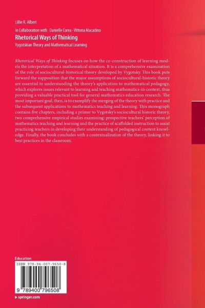 Preface.- Chapter 1 Introduction.- Why Rhetorical Thinking.- Overview of Chapters.- Chapter 2 Vygotsky's Sociocultural Historic Theory, A Primer.- INTRODUCTION.- TOOLS OF HUMAN INTENSIFICATION.- Mediation through Signs.- THE DEVELOPMENT OF HIGHER PSYCHOLOGICAL FUNCTIONS.- Distinguishing Between Lower and Higher Functioning.- THE ROLE OF THE ZONE OF PROXIMAL DEVELOPMENT.- The Complex Nature of the Zone of Proximal Development.- Learning Potential, Performance, and Context.- Intersubjective Learning.- CONCEPT DEVELOPMENT IN THINKING.- Spontaneous and Scientific Concepts.- THE RELATIONSHIP BETWEEN THINKING AND LANGUAGE.- CONCLUSION. Chapter 3 Images and Drawings: A Study of Prospective Teachers' Perceptions of Teaching and Learning Mathematics.- INTRODUCTION.- AN EMERGING FRAMEWORK METHODOLOGY.- Coding Drawings.- Analysis of Focus Group Transcripts.- RESULTS.- The Changing Roles of Teachers.- Student Affect and Pedagogy.- Trends in Mathematical Representations and Content.- Changes in Room Structure.- DISCUSSION OF RESULTS.- CONCLUSION.- Chapter 4 Improving Teachers' Mathematical Content Knowledge through Scaffolded Instruction.- INTRODUCTION.- THEORETICAL FRAMEWORK AND RELEVANT RESEARCH.- Explanation of the Framework.- METHODOLOGY.- Context and Participants.- Data Sources and Procedures.- Data Analysis.- FINDINGS.- Content Knowledge: Pretest and Posttest.- Presurvey and Postsurvey Results.- Talk and Scaffolded-Interactions.- Teacher-learner Talk and the More Knowledgeable Other.- DISCUSSION OF FINDINGS.- Connecting Learning to the Field of Social Interaction.- The Importance of Language and Action.- CONCLUDING COMMENTS.- Chapter 5 Closing Thoughts and Implications.- Teacher-generated Drawings as Tools of Human Development.- Achieving Intersubjectivity through Collaborative Learning.- Index.