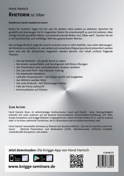 Grundlagen der überzeugenden Redekunst. "Eigentlich heißt eigentlich nicht." Reden Sie Tacheles. Sagen Sie frei, was Sie denken, ohne andere zu verletzen. Sprechen Sie gewählt und überzeugen Sie Ihr Gegenüber. Reden Sie unverkrampft zu und mit anderen. Aber richtig! Korrekt gewählte Wörter und beeindruckende Reden sind 'Silber wert'. Tauchen Sie ein in die faszinierende und vielfältige Welt des gesprochenen Wortes. Das vorliegende Buch zeigt der Leserin und dem Leser in zehn Kapiteln, was unter überzeugender Rhetorik zu verstehen ist, wie verbal und nonverbal erfolgversprechend präsentiert werden kann und wie die Zuhörenden begeistert werden können. Der Inhalt umfasst folgende Themen: - Von der Rhetorik - Die große Kunst zu reden - Nervendes Lampenfieber und beruhigende Anti-Stress-Übungen - Der Präsentation eine nachvollziehbare Struktur verleihen - Der Laie wird Profi - Das intensive Training - Die belebende Interaktion - Lebhafte Körpersprache - Der Körper spricht seit Ewigkeiten - Aus Wörtern werden Sätze - Der erste Eindruck - Auf Stimmungen achten - Falls die Presse auftaucht - Kommunikation auf Distanz