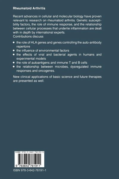 Is Rheumatoid Arthritis a Disappearing Disease?.- Genetics.- Genetic Factors in Rheumatoid Arthritis.- Rheumatoid Arthritis in Southeastern Europe.- Pathogenesis.- Pathogenesis of Rheumatoid Arthritis: Cellular and Cytokine Interactions.- Role of Cellular Adhesion in Rheumatoid Synovitis.- Endothelial Cells and Dendritic Cells in Rheumatoid Inflammation.- Cellular and Humoral Immune Response Against Articular Chondrocytes and Proteoglycans in Rheumatoid Arthritis.- Role and Regulation of Synovial MHC Class II Antigens in Rheumatoid Arthritis and Related Diseases.- CD5+ B Cells and Double-Negative T Cells in Rheumatoid Arthritis.- The Genetics of Rheumatoid Factors (RF): The V-gene Repertoire of RFs in Rheumatoid Arthritis as Analyzed by Hybridoma Clones.- Neutrophil Polymorphonuclear Cell Function in Rheumatoid Arthritis.- Etiologic Factors - Bacterial Antigens, Autoantigens, Viruses.- Heat-Shock Proteins and Mycobacterial Antigens.- Type-II Collagen in the Pathogenesis of Rheumatoid Arthritis.- Streptococcal Cell Wall Antigens and Rheumatoid Arthritis.- Caprine Arthritis-Encephalitis.- Oncogenes and Retroviruses in Rheumatoid Arthritis.- Are Retroviruses Involved in the Pathogenesis of Autoimmune Diseases?.- Epstein-Barr Virus and Rheumatoid Arthritis.- Antibodies to EBV-Encoded Proteins in Rheumatoid Arthritis.- Autoantibodies and Markers of Disease Activity.- The Antiperinuclear Factor (APF) and Antikeratin Antibodies (AKA) in Rheumatoid Arthritis.- Anti-RA33: A New Antinuclear Antibody in Rheumatoid Arthritis.- Acute-Phase Response and Amyloid.- Markers of Cartilage Destruction.- Therapy.- Progress in the Therapy of Rheumatoid Arthritis.- T-Cell Vaccination - A Prospect.