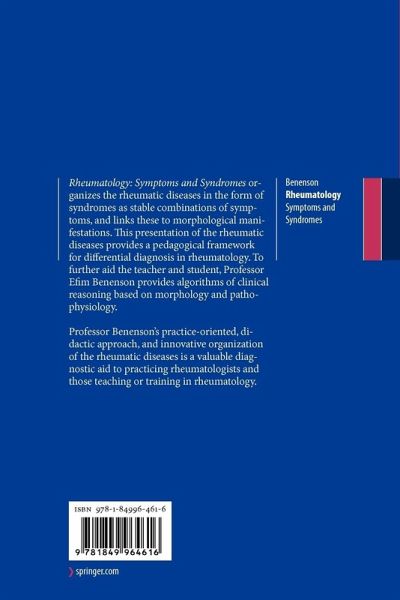 Rheumatology: Symptoms and Syndromes organizes the rheumatic diseases in the form of syndromes as stable combinations of symptoms, and links these to morphological manifestations. This presentation of the rheumatic diseases provides a pedagogical framework for differential diagnosis in rheumatology. To further aid the teacher and student, Professor Efim Benenson provides algorithms of clinical reasoning based on morphology and pathophysiology. Professor Benenson's practice-oriented, didactic approach, and innovative organization of the rheumatic diseases is a valuable diagnostic aid to practicing rheumatologists and those teaching or training in rheumatology.