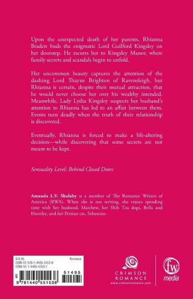 Upon the unexpected death of her parents, Rhianna Braden finds the enigmatic Lord Guilford Kingsley on her doorstep. He escorts her to Kingsley Manor, where family secrets and scandals begin to unfold. Her uncommon beauty captures the attention of the dashing Lord Thayne Brighton of Ravensleigh, but Rhianna is certain, despite their mutual attraction, that he would never choose her over his wealthy intended. Meanwhile, Lady Lydia Kingsley suspects her husband's attention to Rhianna has led to an affair between them. Events turn deadly when the truth of their relationship is discovered. Eventually, Rhianna is forced to make a life-altering decision-while discovering that some secrets are not meant to be kept. Sensuality Level: Behind Closed Doors