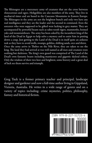 The Rhinogres are a mercenary army of creatures that are the cross between rhinoceroses and ogres. Hobgoblins are also members of the army. They live in mediaeval times and are based in the Caucasus Mountains in Eastern Europe. The Rhinogres in the army are not the brightest bunch and only two have any real intelligence and they are the leader and the second in command. Even the sorcerers who were supposed to be gifted were lacking in grey matter. They are accompanied by powerful beasts such as sabre-tooth tigers, mammoths, horned yaks and mountainboars. The army has been asked by the incumbent king of the land of the Dead in Egypt to help solve a mystery and to assist him in putting down a coup. Just getting to the Land of the Dead is in itself quite an arduous task as they have to avoid trolls, swamps, goblins, shifting sands, orcs and thirst. Once the army arrive in Thebes on the Nile River, they are taken to see the king. The land they had arrived at was well named as all men and creatures were nothing but skeletons. The king's own guard was comprised of The Land of the Dead's own fantastic beasts including manticores and gigantic skeletal cobras. Only the wisdom of their two best and brightest, some bravery and a great deal of luck see them survive and triumph.