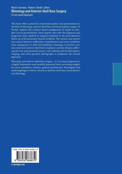 Rhinology and Anterior Skull Base Surgery - A Case-based Approach is a highly informative and carefully presented book, providing insights for exam candidates, trainees, general practitioners, rhinologists and otolaryngologists with an interest in anterior skull base, facial plastics and rhinology.