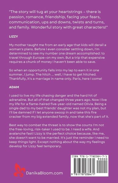"The story will tug at your heartstrings - there is passion, romance, friendship, facing your fears, communication, ups and downs, twists and turns, and family. Wonderful story with great characters!" LIZZY My mother taught me from an early age that kids will derail a woman's plans. Before I even consider settling down, I'm determined to see my number one dream accomplished: to travel through Europe-on my own. A trip that expensive requires a chunk of money I haven't been able to save. So when an opportunity falls into my lap to earn it all-and then some-in one summer, I jump. The hitch ... well, I have to get hitched. Thankfully, it's a marriage in name only. Paris, here I come! ADAM I used to live my life chasing danger and the hard hit of adrenaline. But all of that changed two years ago. Now I live my life for a flame-haired five-year-old named Olivia. Being a single dad to my best friends' daughter was not my plan, but I'll be damned if I let anyone swoop in and take this fire cracker from my big extended family, now that she's part of it. Best way to combat the threat is to show the courts I'm not the free-loving, risk-taker I used to be. I need a wife. And avalanche fast! Lizzy is the perfect choice because, like me, she doesn't want to be married. It's just the reminder I need to keep things light. Except nothing about the way my feelings develop for Lizzy feels temporary. ~~~ Rhodes to Love: Daring with the Single Dad is the fourth stand-alone book in the new adult, contemporary romance series, The Mixed Six-Pack. If you like quirky, witty banter, smart & funny heroines, a grumpy single father, and a meddling family (especially Nana!) you'll adore Danika Bloom's steamy friends-to-lovers, fake marriage romcom.