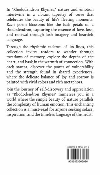 In "Rhododendron Rhymes," nature and emotion intertwine in a vibrant tapestry of verse that celebrates the beauty of life's fleeting moments. Each poem blossoms like the lush petals of a rhododendron, capturing the essence of love, loss, and renewal through lush imagery and heartfelt language. Through the rhythmic cadence of its lines, this collection invites readers to wander through meadows of memory, explore the depths of the heart, and bask in the warmth of connection. With each stanza, discover the power of vulnerability and the strength found in shared experiences, where the delicate balance of joy and sorrow is painted with vivid colors and rich metaphors. Join the journey of self-discovery and appreciation as "Rhododendron Rhymes" immerses you in a world where the simple beauty of nature parallels the complexity of human emotion. This enchanting collection is a must-read for anyone seeking solace, inspiration, and the timeless language of the heart.