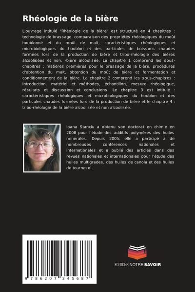 L'ouvrage intitulé "Rhéologie de la bière" est structuré en 4 chapitres : technologie de brassage, comparaison des propriétés rhéologiques du moût houblonné et du moût de malt, caractéristiques rhéologiques et microbiologiques du houblon et des particules de boissons chaudes formées lors de la production de bière et tribo-rhéologie des bières alcoolisées et non. -bière alcoolisée. Le chapitre 1 comprend les sous-chapitres : matières premières pour le brassage de la bière, procédures d'obtention du malt, obtention du moût de bière et fermentation et conditionnement de la bière. Le chapitre 2 comprend les sous-chapitres : introduction, matériel et méthodes, échantillon, mesure rhéologique, résultats et discussion et conclusions. Le chapitre 3 est intitulé : caractéristiques rhéologiques et microbiologiques du houblon et des particules chaudes formées lors de la production de bière et le chapitre 4 : tribo-rhéologie de la bière alcoolisée et non alcoolisée.