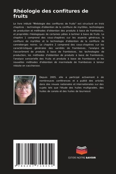 Le livre intitulé "Rhéologie des confitures de fruits" est structuré en trois chapitres : technologie d'obtention de la confiture de myrtilles, technologies de production et méthodes d'obtention des produits à base de framboises, et propriétés rhéologiques de certaines pâtes à tartiner à base de fruits. Le chapitre 1 comprend des sous-chapitres sur les aspects généraux, la confiture de myrtilles et la technologie d'obtention de la confiture de canneberges noires. Le chapitre 2 comprend des sous-chapitres sur les caractéristiques générales des variétés de framboises, l'analyse de l'assortiment de produits à base de framboises, les technologies de production, les méthodes d'obtention de produits à base de framboises, l'analyse sensorielle des fruits et produits à base de framboises et les nouvelles méthodes d'obtention de marmelade de framboises à teneur réduite en saccharose.